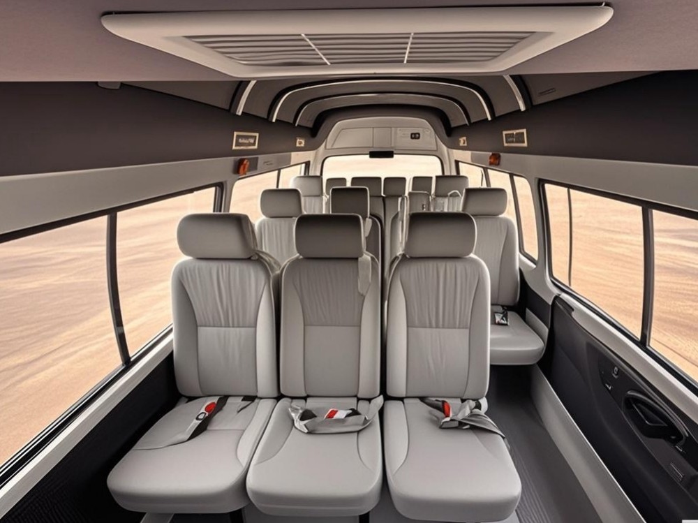 The interior space is spacious with 9-15 multi shaped leather seaters. These seats feature an ergonomic design, conforming to the human body's curves for a comfortable ride. The combined steps at the middle door make getting on and off the vehicle easily, creating a courteous atmosphere for passengers.
